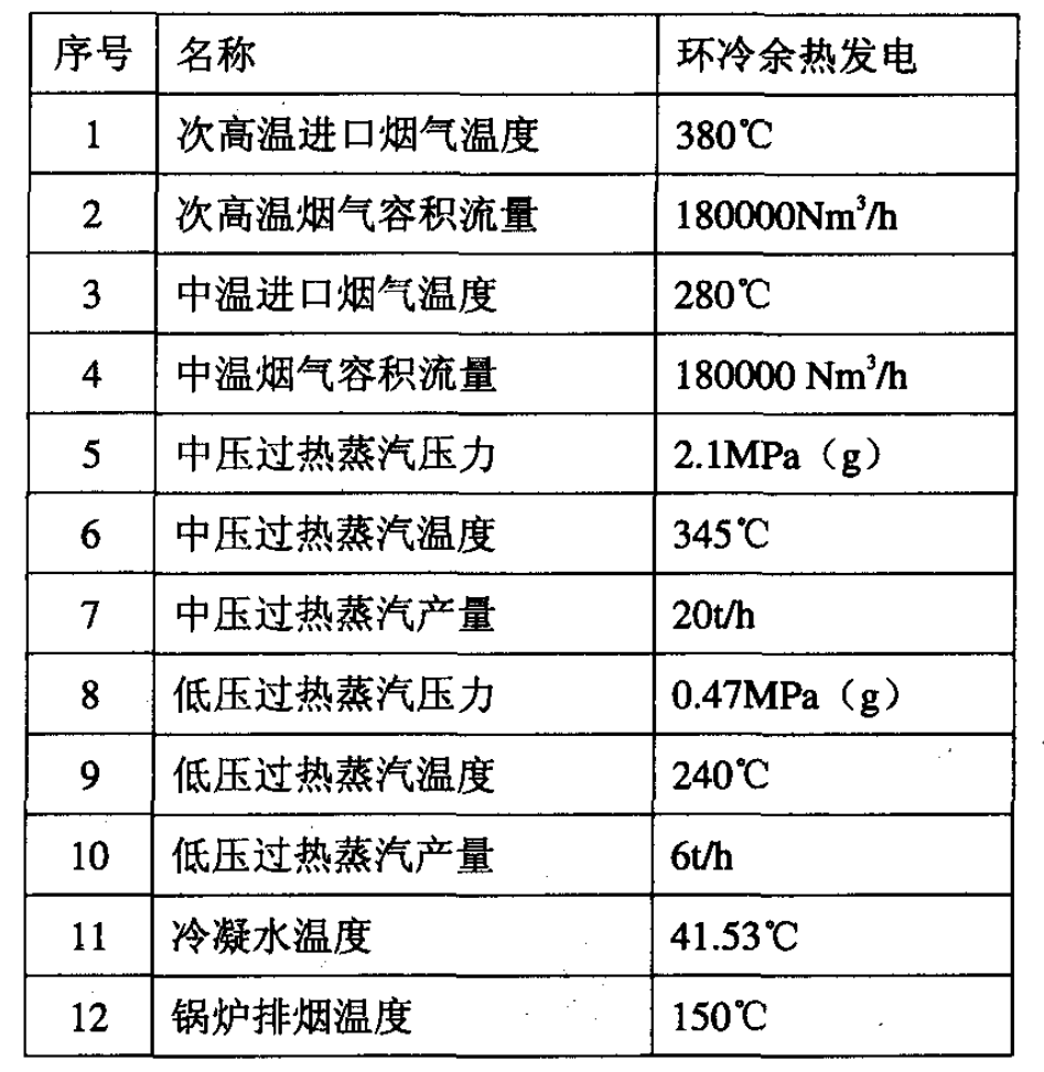根據本電站的設計原始參數,按照環冷機的余熱利用量,余熱鍋爐設計參數如下表3-1: