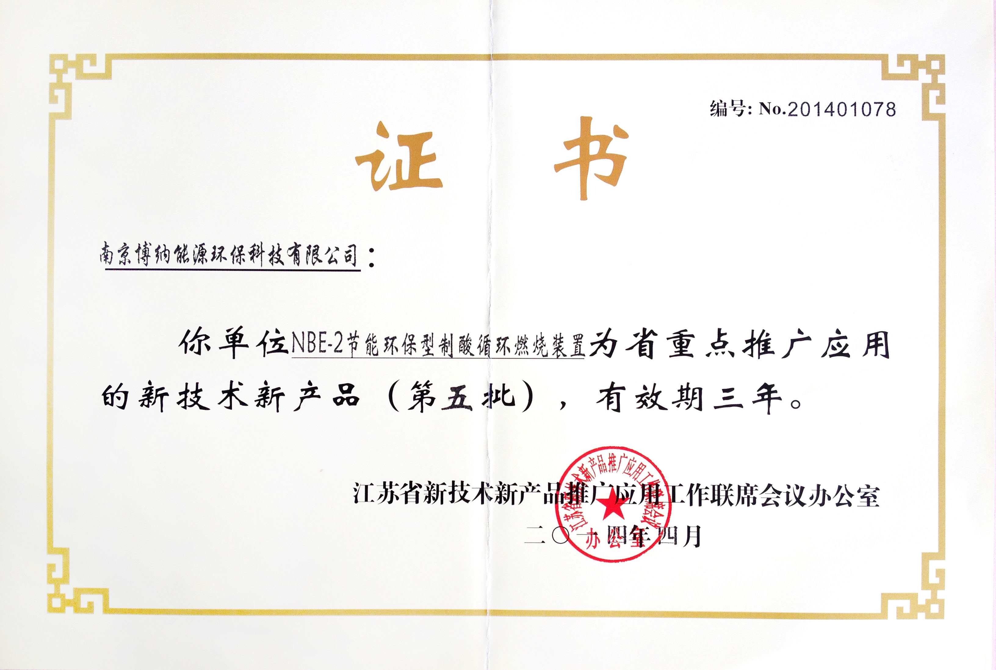 博納科技硫回收及WSA制酸工藝熱解焚燒爐燃燒器獲得江蘇省重點推廣應用的新技術新產(chǎn)品認證。